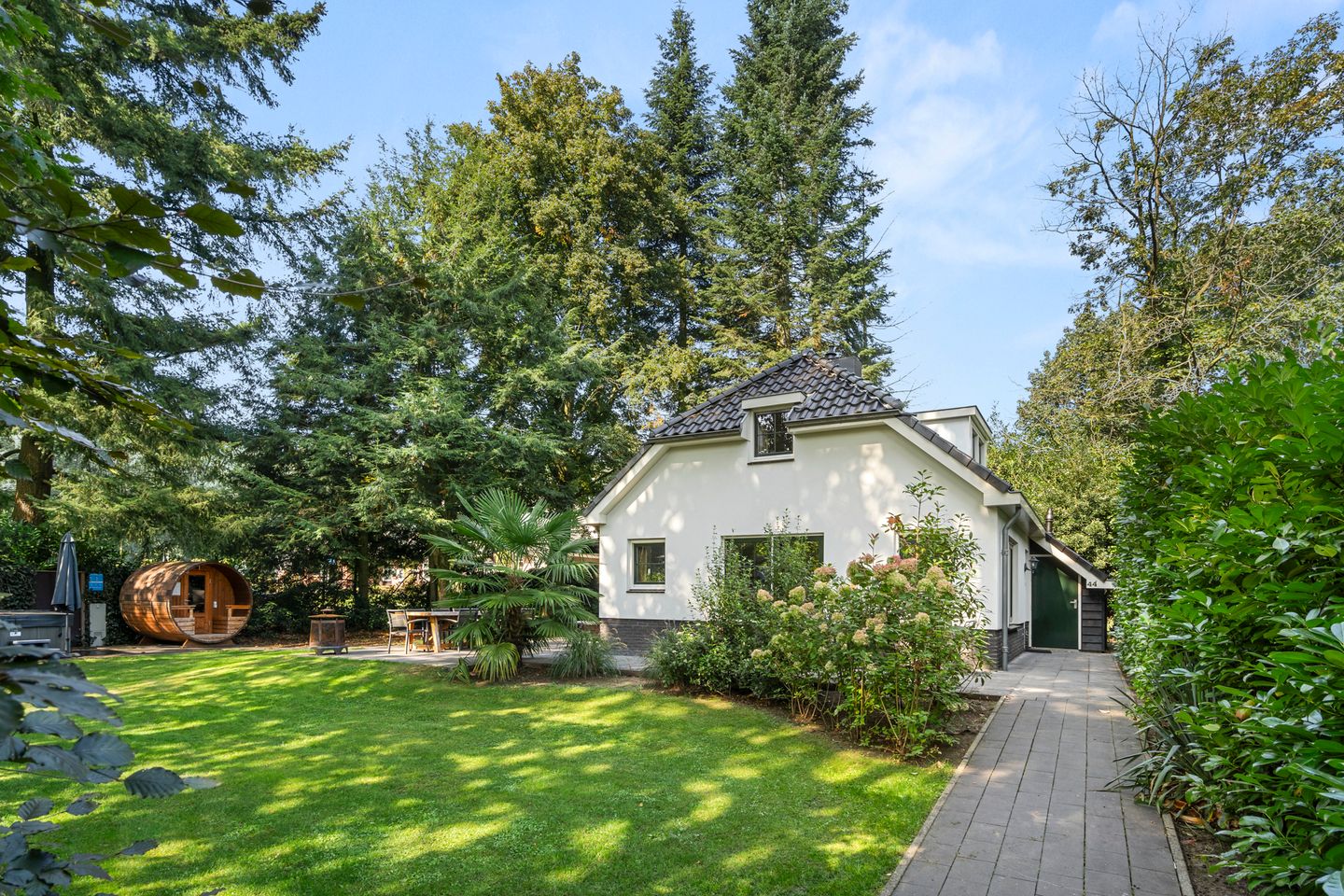 De recreatiewoning beschikt over een schitterende, royale tuin die de woning volledig omringt. Deze zorgvuldig aangelegde tuin biedt een harmonieuze mix van bestrating, gazon en diverse groene beplanting, waardoor er altijd een plekje is om optimaal van het buitenleven te genieten. Het terras vormt een ideale locatie voor een buitentafel, waar u samen met vrienden en familie lange zomeravonden kunt doorbrengen. Hier kunt u heerlijk ontspannen en uw dag in stijl afsluiten. Vanaf het terras leidt een uitnodigend pad u naar enkele bijzondere extra's van deze recreatiewoning: een jacuzzi, een buitendouche en een luxe sauna. Deze faciliteiten verhogen het gevoel van comfort en luxe, en maken van deze woning de ideale plek om volledig tot rust te komen en te genieten van een wellness-ervaring in uw eigen tuin.