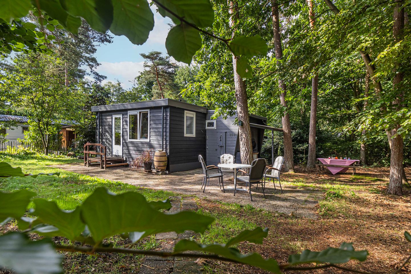 De bostuin rondom het chalet maakt het plaatje compleet — een plek waar je écht kunt onthaasten. Het perceel ligt aan het einde van een straatje en is gelegen tegen de rand van het park. Hierdoor ervaar je veel rust en privacy. Je waant je in het groen met de bomen rondom en hebt verschillende mogelijkheden om heerlijke zitplekken te realiseren.