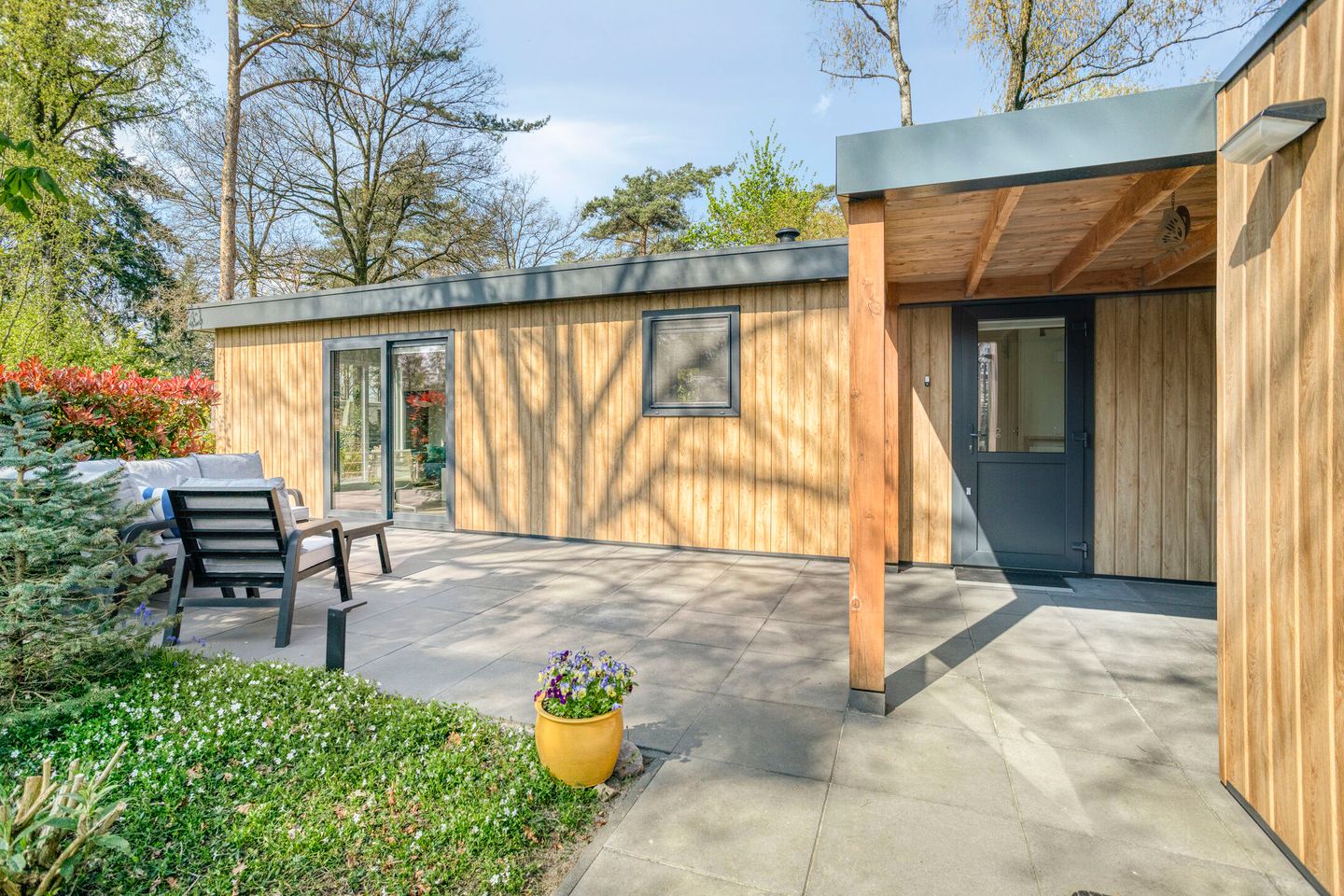 De tuin is fraai aangelegd en vormt een verzorgde en praktische buitenruimte. Op het perceel bevindt zich een geïsoleerde schuur, uitgevoerd in hetzelfde materiaal als het chalet en voorzien van water- en elektra-aansluiting. Tussen het chalet en de schuur is een overkapping gerealiseerd, wat zorgt voor een beschutte plek. Daarnaast beschikt het geheel over een ruime eigen parkeerplaats.