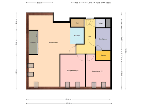 Middels de entree betreedt u het appartement in de hal. De hal biedt toegang tot de twee slaapkamers, badkamer, toilet, bergkast en de woonkamer. De woonkamer beschikt over een open keuken en de toegang naar het inpandige balkon (loggia).