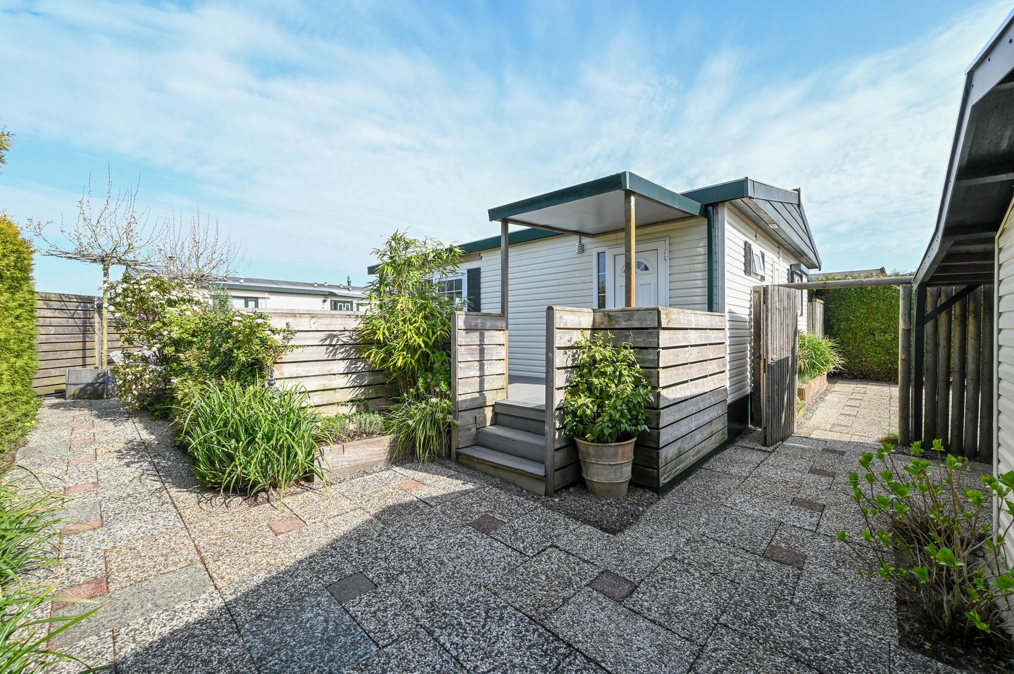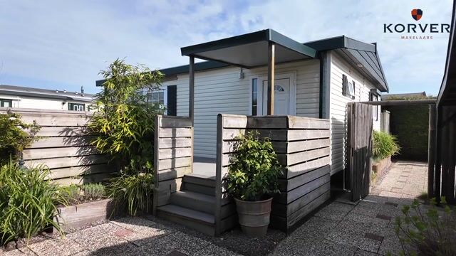 Buiten wordt het pas echt genieten. De veranda, net als de woning degelijk gefundeerd, is een heerlijke plek om te ontspannen. De tuin rondom biedt een perfecte mix van zon en schaduw, met meerdere fijne zitplekken. Achter de woning vind je een sfeervolle overkapping met schaduwdoek, ideaal voor lange zomeravonden. Aan de voorzijde staat een schuur met konijnen-/kippenhok en een overkapping voor fietsen. Daarnaast is er een afsluitbare overkapping naast de woning voor extra bergruimte.