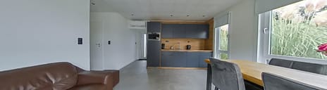Vinyl vloer, schuifpui, airco en spots in het plafond.
