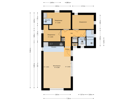Via de hal bereik je drie comfortabele slaapkamers. Eén daarvan beschikt over een eigen en-suite badkamer met inloopdouche en wastafelmeubel. De tweede badkamer, eveneens met inloopdouche en wastafelmeubel, is vanuit de hal toegankelijk. Een vlizotrap biedt toegang tot een ruime, afgesloten zolder, ideaal voor het opbergen van persoonlijke spullen. Daarnaast vind je in de hal een apart toilet en een praktische bergkast met aansluiting voor de wasmachine.