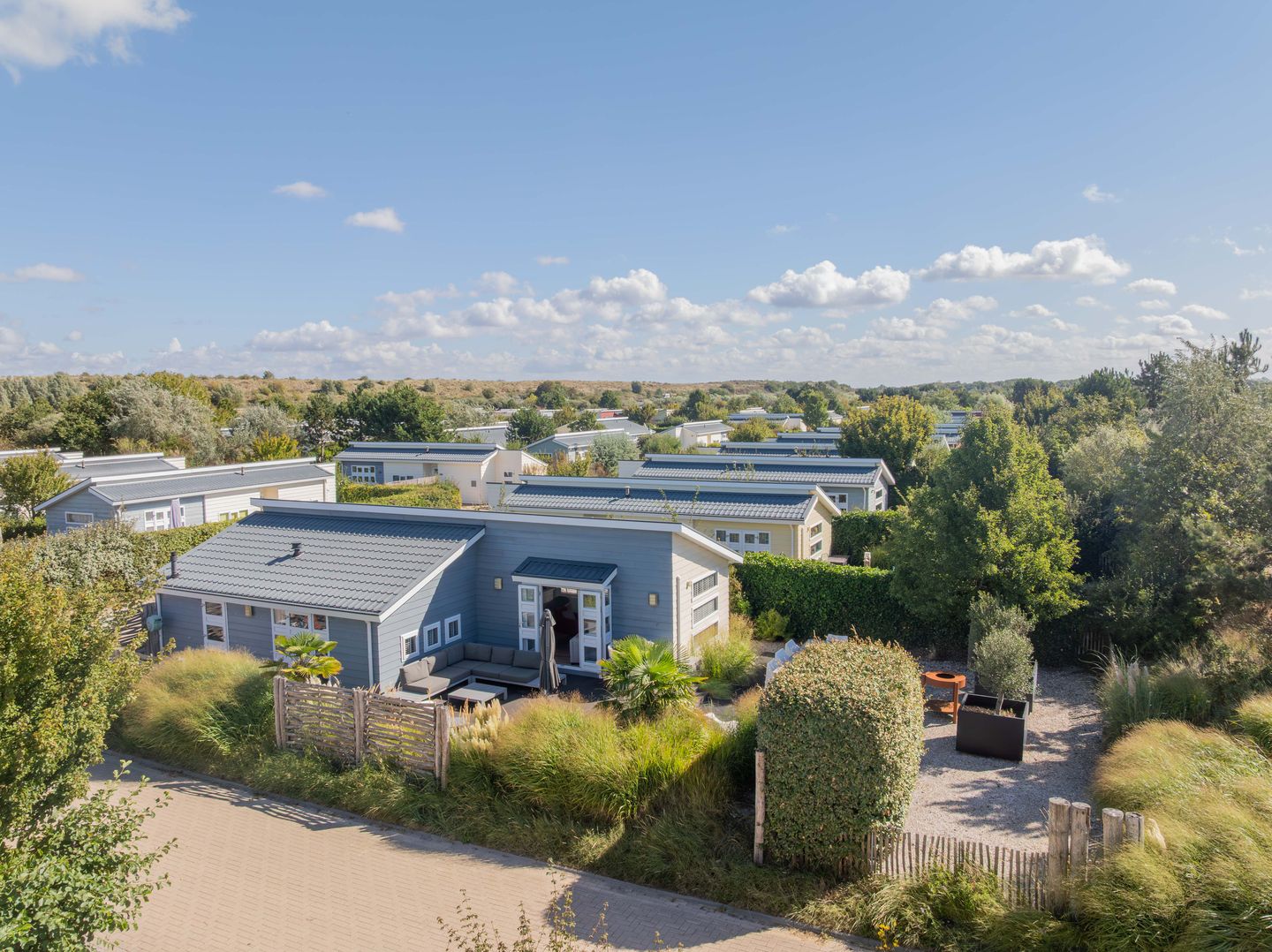De tuin is fraai aangelegd met diverse zonneterrassen. Zo is het direct uit de woonkamer heerlijk vertoeven op het lounge terras, het schelpenterras aan de voorzijde is ingericht met een royale eettafel. Naast het chalet bevindt zich een privé parkeerplaats. De volledig afgesloten tuin met strandpalen en helmgras biedt 100% privacy, een heerlijke plek!