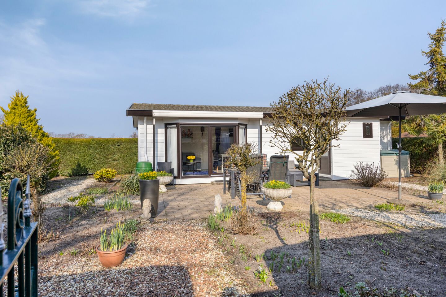 De fraai aangelegde tuin beschikt over een ruim terras en groene borders, waardoor er een fijne plek is ontstaan om van het buitenleven te genieten. In de tuin bevindt zich tevens een vrijstaande schuur, voorzien van elektriciteit en een aansluiting voor de wasmachine. Daarnaast beschikt het chalet over een eigen parkeerplaats, gelegen tegenover het chalet.
