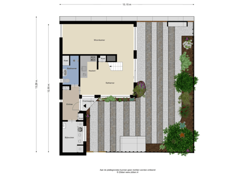 De woning beschikt over een fraai aangelegde L-vormige tuin met volop ruimte om te ontspannen, te genieten van het zonnetje of uitgebreid te dineren in de buitenlucht. De tuin is omgeven door een combinatie van een schutting en groene beplanting, wat zorgt voor optimale privacy en een fijne, beschutte sfeer.