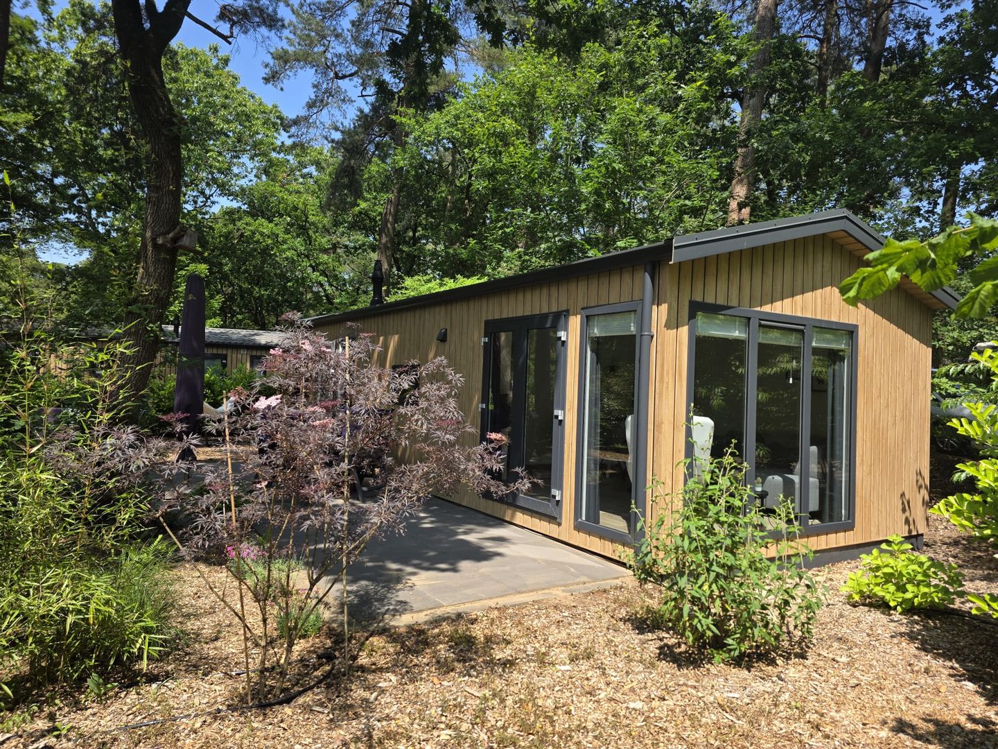 Rondom de lodge ligt een prachtige, natuurlijke tuin die naadloos overgaat in de omliggende bossen. Hier ervaart u de rust en privacy van het buitenleven, terwijl eekhoorns en vogels uw dagelijkse bezoekers zijn. Het ruime terras, direct grenzend aan de lodge, is dé perfecte plek om te genieten van uw ochtendkoffie in de zon of lange zomeravonden met vrienden en familie. Dankzij de ligging midden in de natuur komt u hier helemaal tot rust, omringd door hoge bomen, frisse boslucht en de serene geluiden van de Veluwe. Op het perceel staat bovendien een ruime berging, ideaal voor het opbergen van fietsen, tuingereedschap (inbegrepen) of extra spullen. De omgeving van het park biedt talloze recreatiemogelijkheden. Op korte afstand ligt de Zandenplas, een idyllisch bosmeer waar u heerlijk kunt zwemmen en zonnen. Ook het Veluwemeer, ideaal voor watersportliefhebbers, bevindt zich op slechts tien minuten rijden.