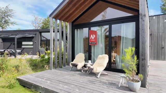 De cabin staat op een perceel van maar liefst ca. 335 m², omgeven door groen en met een zonnige ligging. De veranda met overkapping nodigt uit tot lange zomeravonden buiten of een ontspannen koffiemoment in de ochtendzon. Dankzij de harmonica-deur en schuifpui vormt de tuin écht een verlengstuk van de woonkamer. De tuin biedt volop privacy en ruimte voor speelplezier, ontspanning of tuinieren.