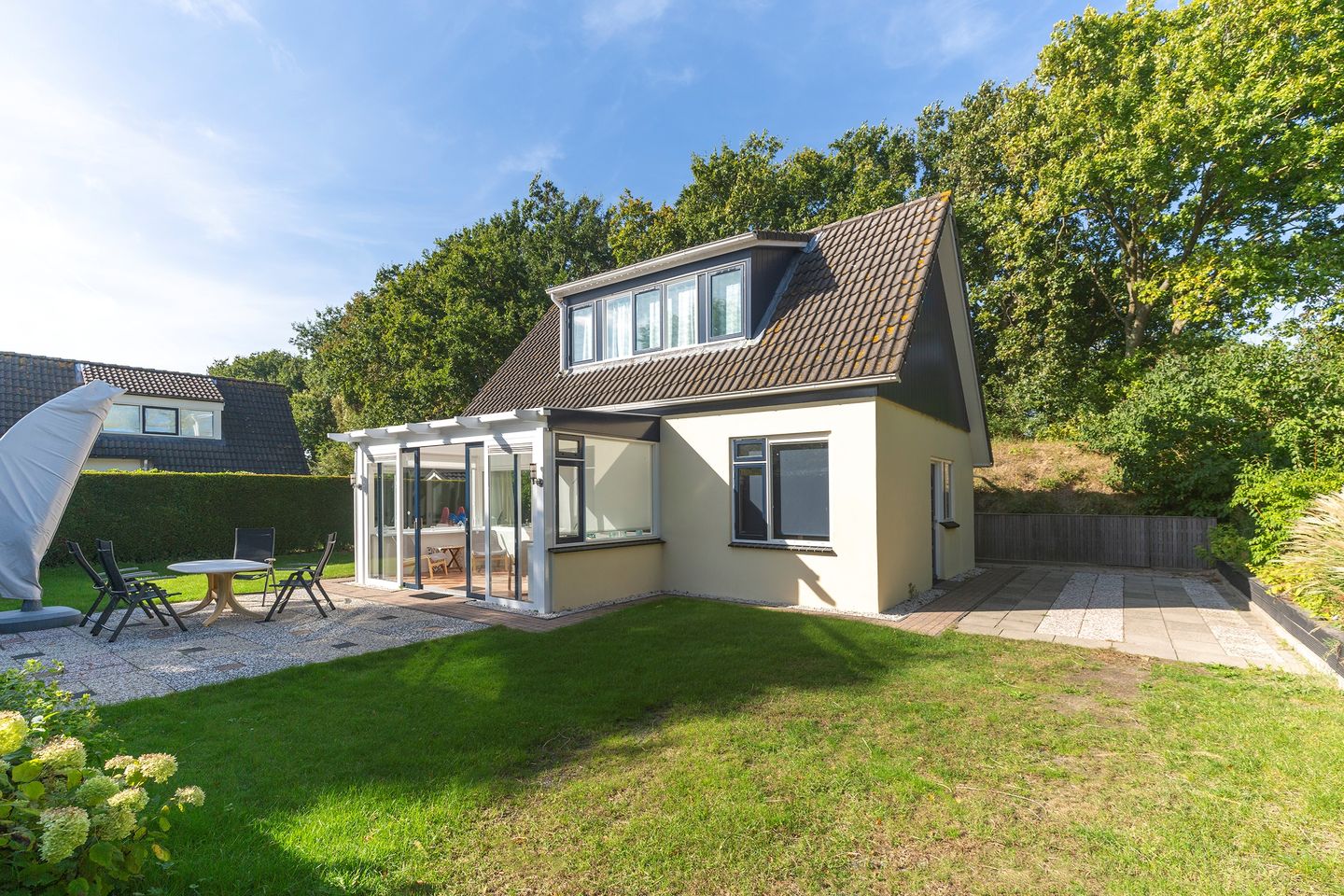 De tuin rondom de woning is keurig aangelegd, met een combinatie van gazon en bestrating. Hierdoor zijn er zowel aan de achterzijde als aan de voorzijde van de serre zitgelegenheden gecreëerd, waardoor er diverse plekjes zijn om van de zon te genieten. De heg die het perceel omringt, draagt bij aan extra privacy en beschutting.