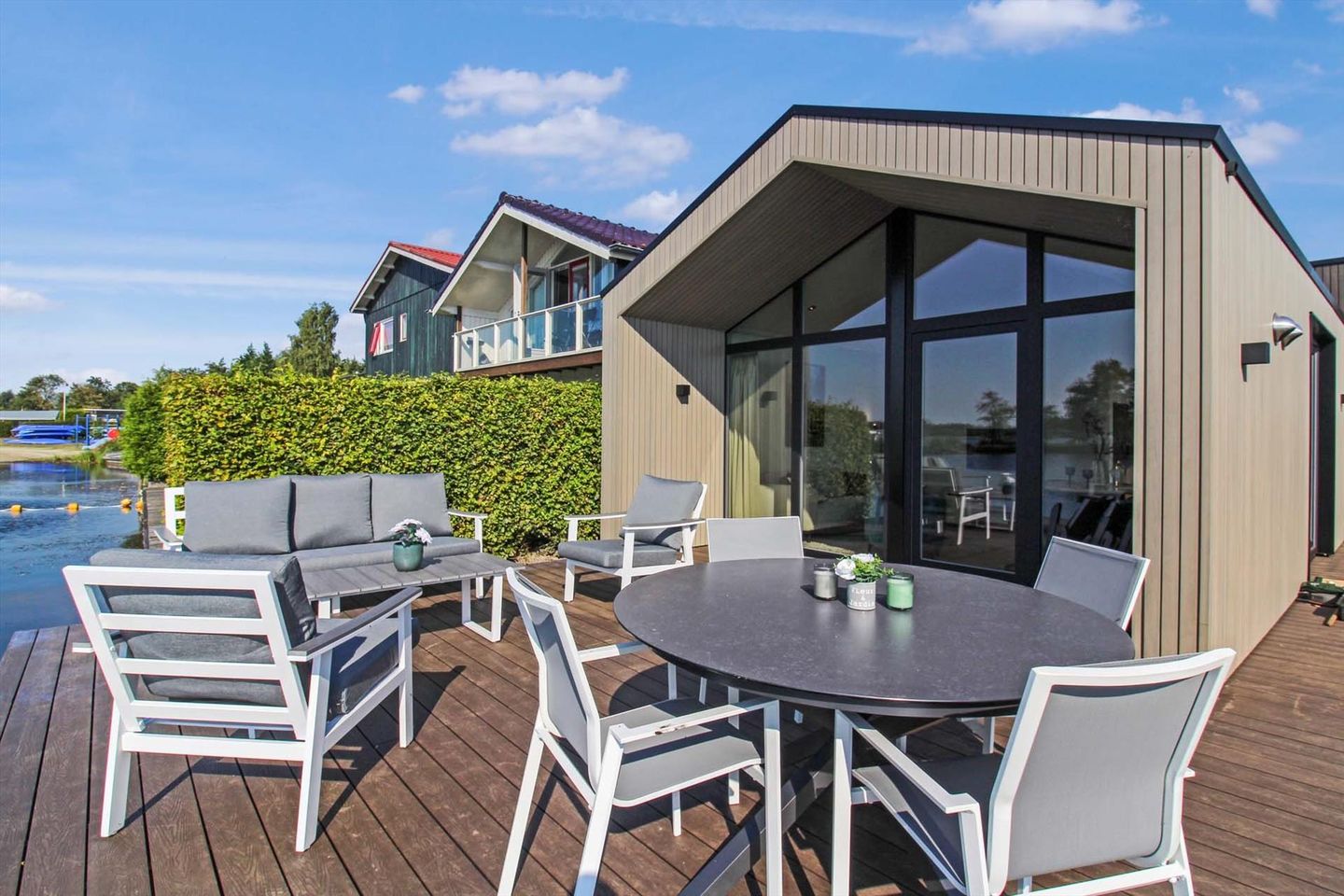 Het ultieme hoogtepunt van de waterlodge: het ruime vlonderterras dat zich uitstrekt aan de voorzijde en de zijkant van de woning. Hier is het genieten van een ochtendkoffie, een goed boek of samen dineren terwijl je geniet van de rustgevende geluiden van de natuur. Het terras biedt een prachtige plek om te ontspannen en te genieten van de heerlijke buitenlucht.