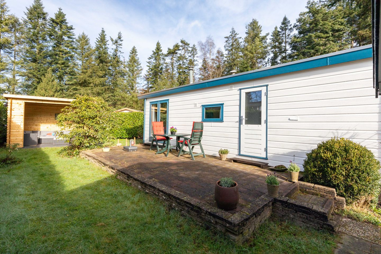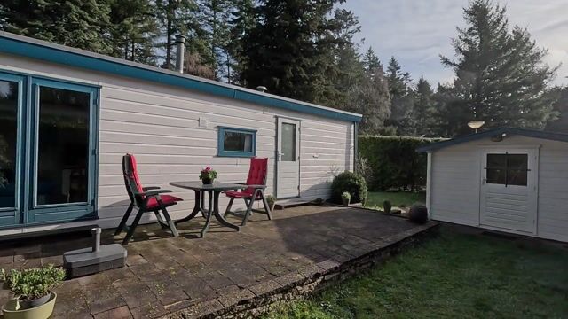De beschutte tuin rondom het chalet is met zorg ingericht en biedt meerdere zitmogelijkheden om op verschillende momenten van de dag van de zon of juist van de schaduw te genieten. In de hoek van het perceel bevindt zich een overkapte veranda waar u heerlijk beschut buiten kunt zitten. De tuin is grotendeels omheind met heggen, wat zorgt voor extra privacy en een groene, natuurlijke uitstraling. Daarnaast beschikt het perceel over een praktische berging en een eigen parkeerplek.