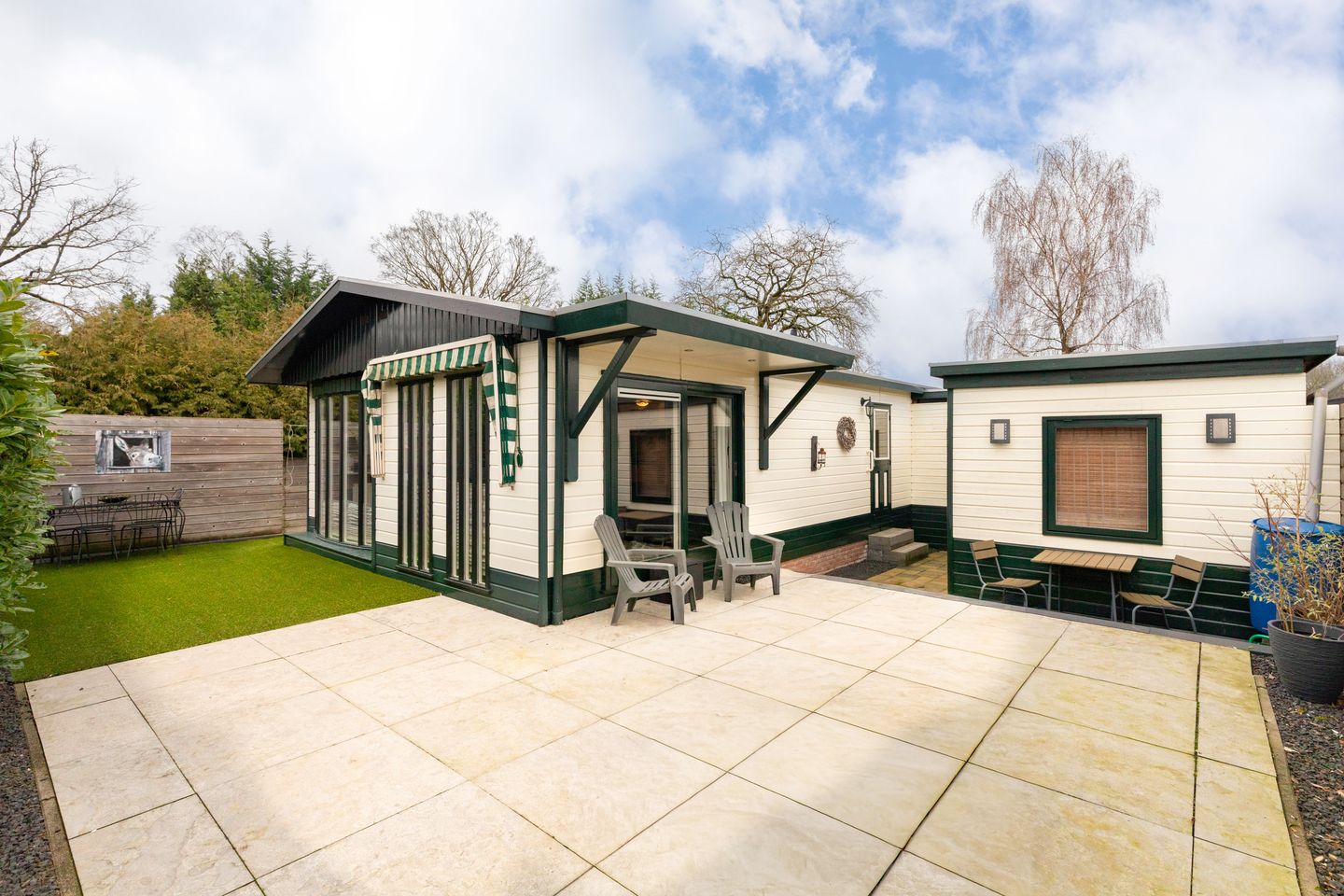 Rondom de woning bevindt zich een verzorgde tuin met veel buitenruimte, waar u op elk moment van de dag kunt genieten van zon of schaduw. De berging biedt extra opbergruimte en is voorzien van een aansluiting voor een wasmachine. Parkeren kan overdekt en direct bij het chalet, wat het comfort compleet maakt.