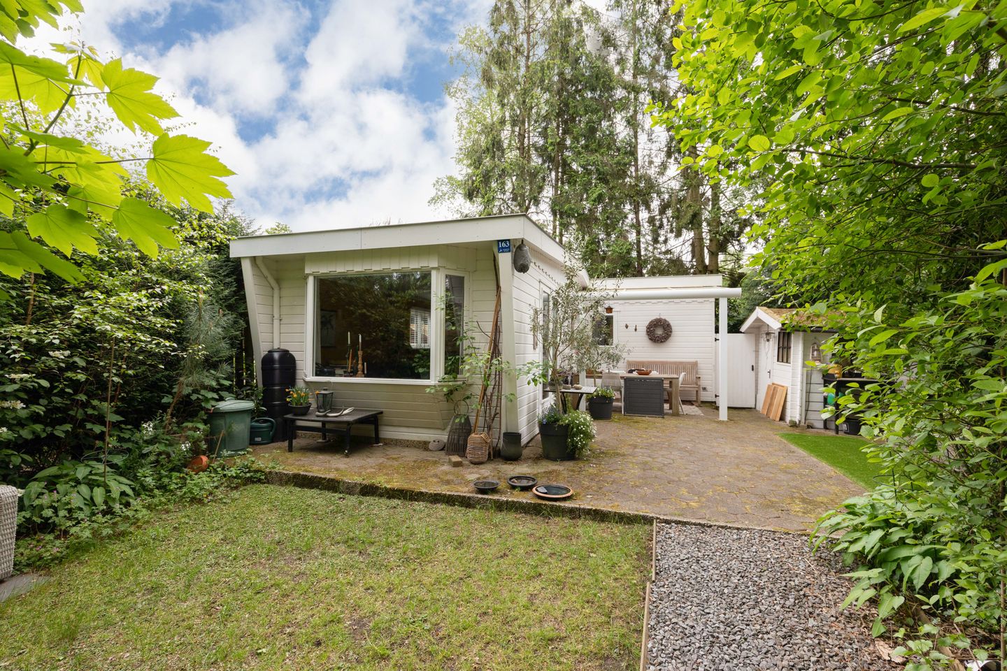 De tuin is fraai aangelegd met veel groen en biedt dankzij de gunstige zuidligging en omliggende beplanting veel zon en privacy. Ook is er een houten berging aanwezig voor fietsen of tuinspullen.