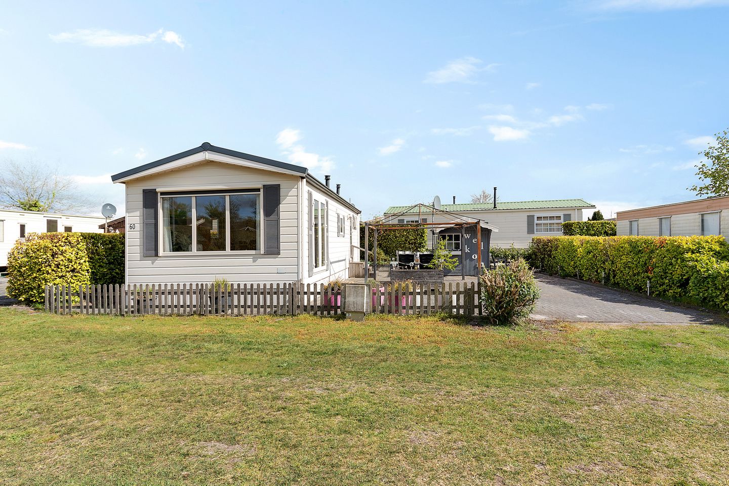 Ruime zijtuin met groot terras en royale parkeerplaats op eigen terrein. Het terras is verhard met betonklinkers. De tuin is zonnig en aan de zijkanten en achterzijde afgescheiden middels groenblijvende hagen. Er is ruimte om om het chalet heen te kunnen komen.