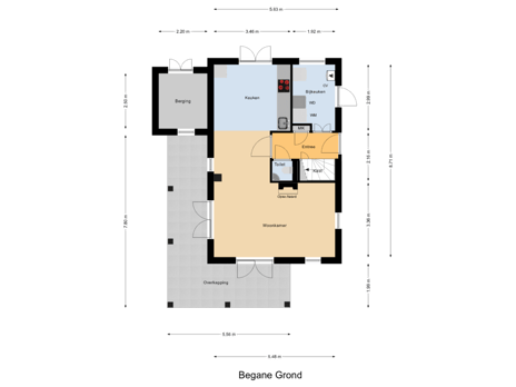 oppervlakte is nu ca. 23 m2 exclusief de keukenruimte. De open keuken is ca. 3.46 x 2.99 en voorzien