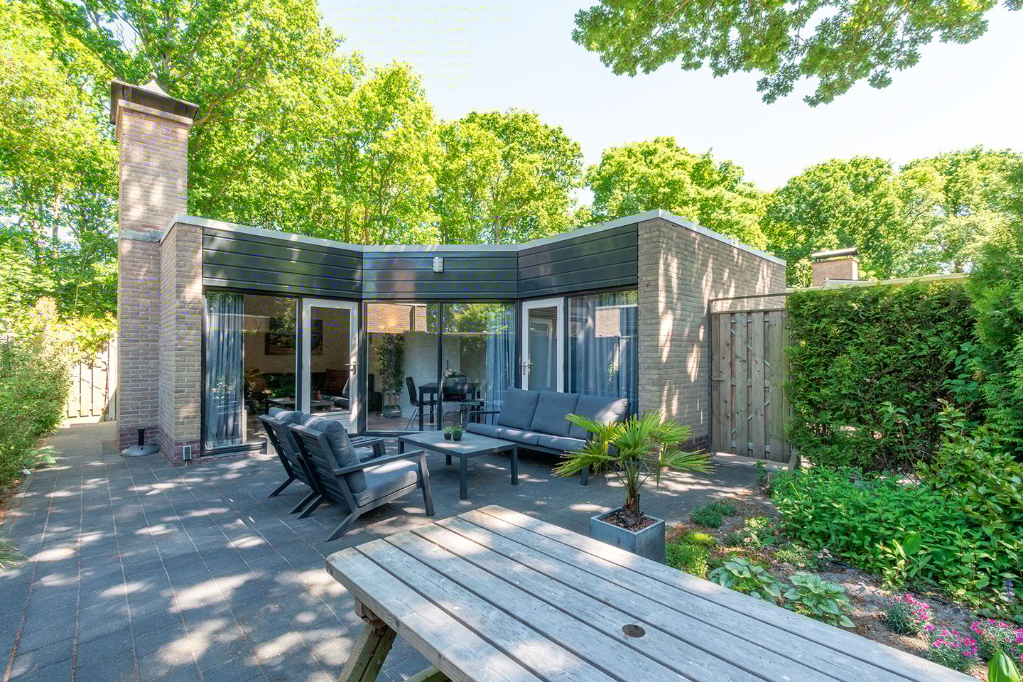 De beschutte tuin is een absolute blikvanger. U vindt hier meerdere fijne zitplekken – zowel in als uit de zon – omringd door groen.