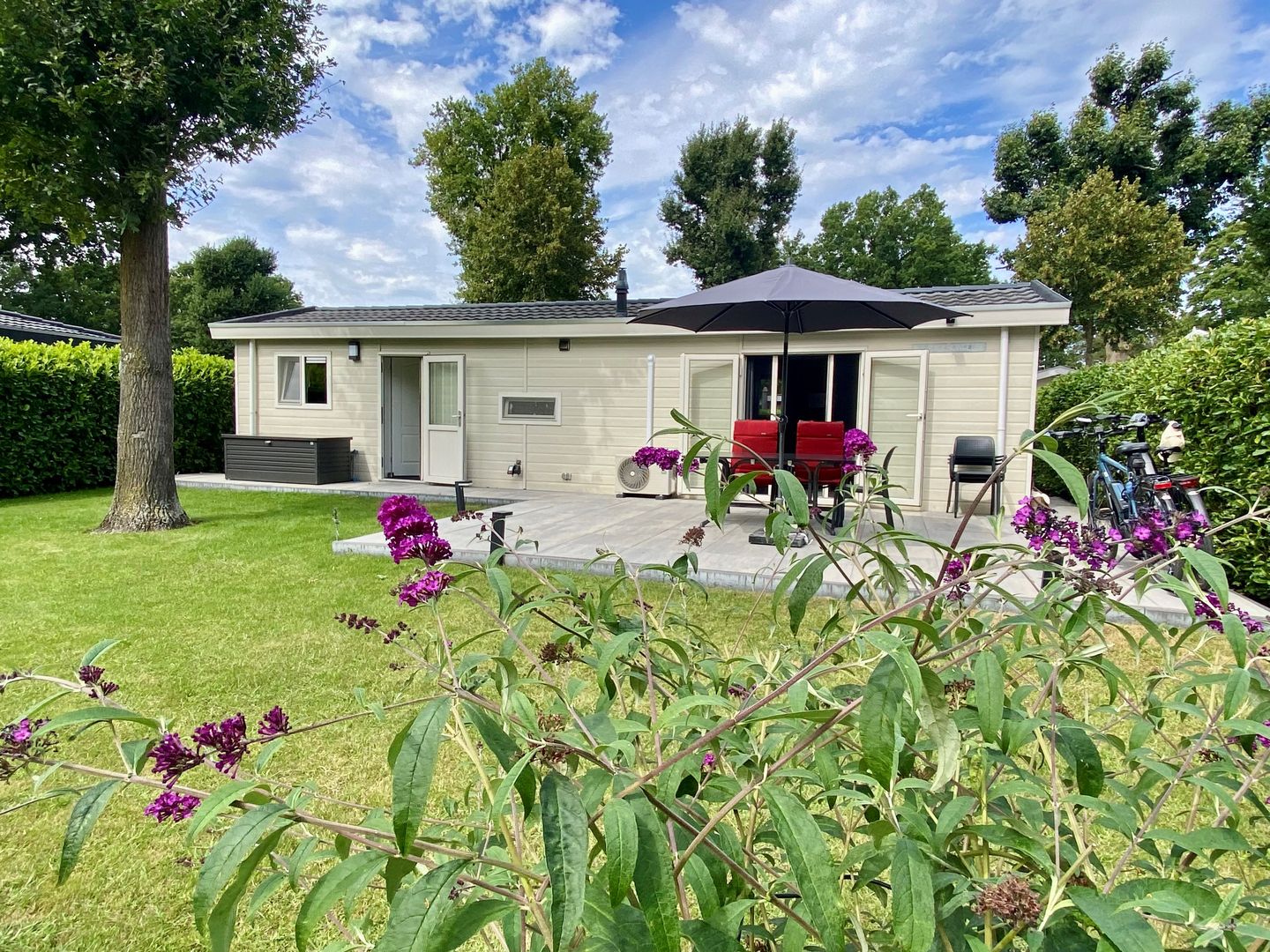 De woning is in 2022 volledig gemoderniseerd, beschikt over een lichte woonkamer, open keuken, twee slaapkamers en een moderne badkamer. De fraai aangelegde tuin met terras en uitzicht op de vijver zorgt voor een ultiem vakantiegevoel – elke dag opnieuw. En parkeren? Dat doet u gewoon op eigen terrein.
