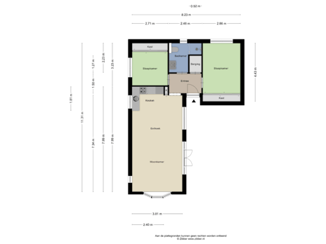 Bij binnenkomst ervaar je direct de ruimte en het licht dankzij de lichte wanden en de doorlopende laminaatvloer. De entree geeft toegang tot de badkamer met toilet, de twee slaapkamers, en de open doorloop naar de woonkamer.