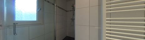 De twee slaapkamers zijn stuk voor stuk ruim en licht. De badkamer is ruim en stijlvol met lichte wandtegels, donkere vloertegels, een douche, een groot wastafelmeubel met veel opbergruimte en witgoedaansluitingen.