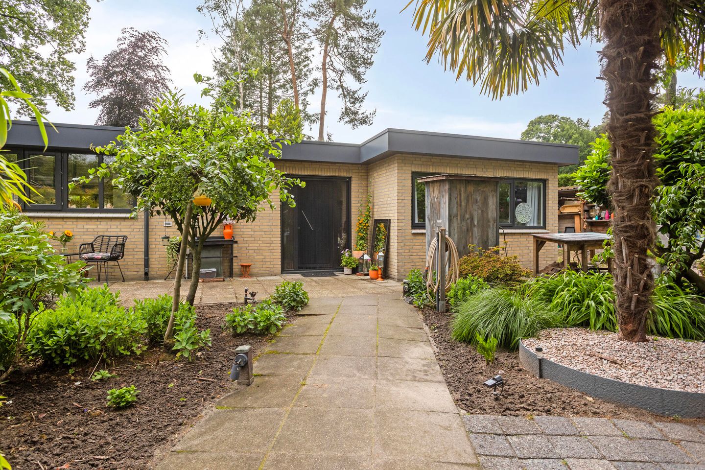 De riante tuin ligt rondom de woning en biedt volop privacy. Dankzij meerdere terrassen, een pergola, een vijver, sierbestrating en gevarieerde beplanting is het hier optimaal genieten van het buitenleven. De tuin is volledig omheind, waardoor rust en veiligheid gewaarborgd zijn. Er is een grondwaterpomp aanwezig met meerdere waterpunten, ideaal voor het beregenen van de tuin.