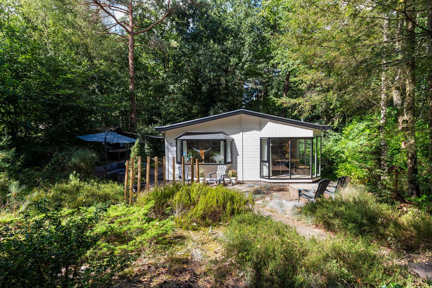 Tuin met veel begroeiing rondom het perceel met bomen en struiken, hierdoor heeft u veel privacy. Ook beschikt de tuin over een vrijstaande houten berging v.v. elektra waar u bijvoorbeeld tuinstoelen, fietsen en het tuingereedschap kunt opbergen. Daarnaast zijn er meerdere zitplekjes gecreëerd in de tuin. De eigen auto kan voor het perceel op een kleinschalige parkeerplaats geparkeerd worden, dit geldt alleen voor de woningen aan de rand van het park. Overige auto’s dienen geparkeerd te worden op de algemene parkeerplaats.
