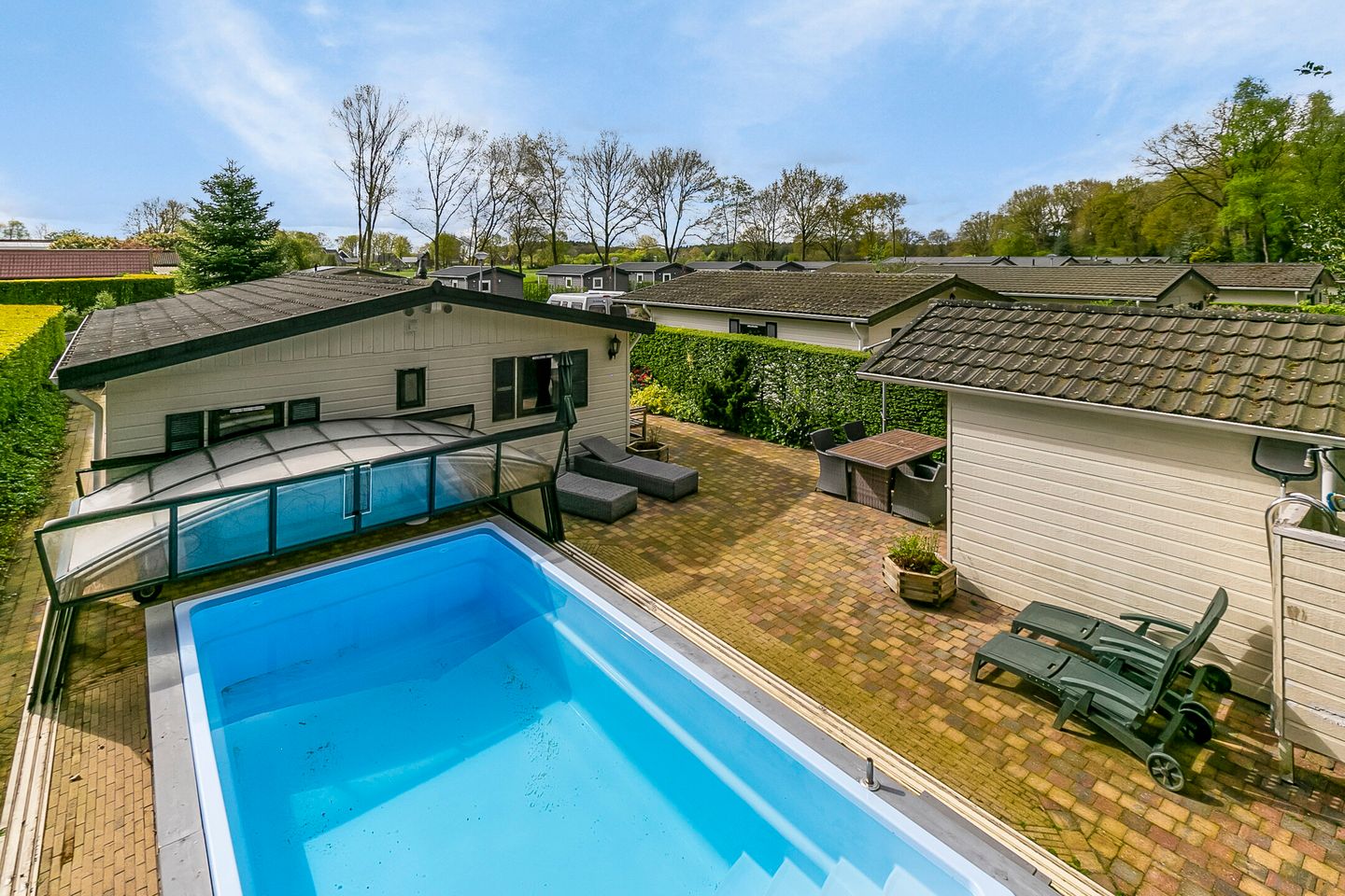 Rondom het chalet ligt een keurig aangelegde tuin met meerdere zitjes, veel zon en een eigen oprit. Het zwembad (ca. 130 cm diep) is overdekt en voorzien van een zandfilter e.d.