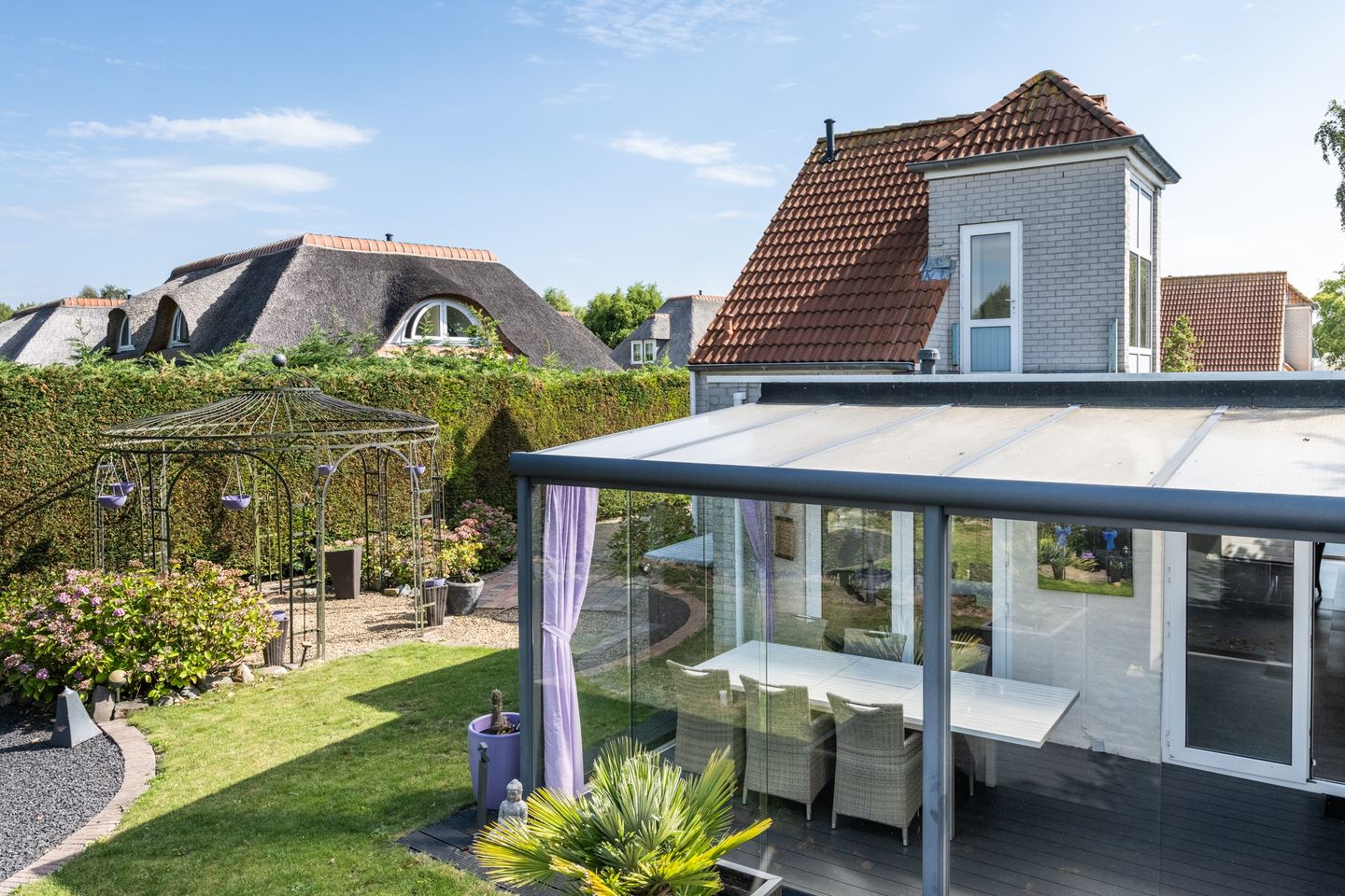 De serre is een hele prettige ruimte, zowel in de zomer als in de winter. Deze ruimte is voorzien van composiet vloer, lounge set, vuurtafel op gas en kast. Door het vele glas heeft u veel contact met de royale achtertuin.