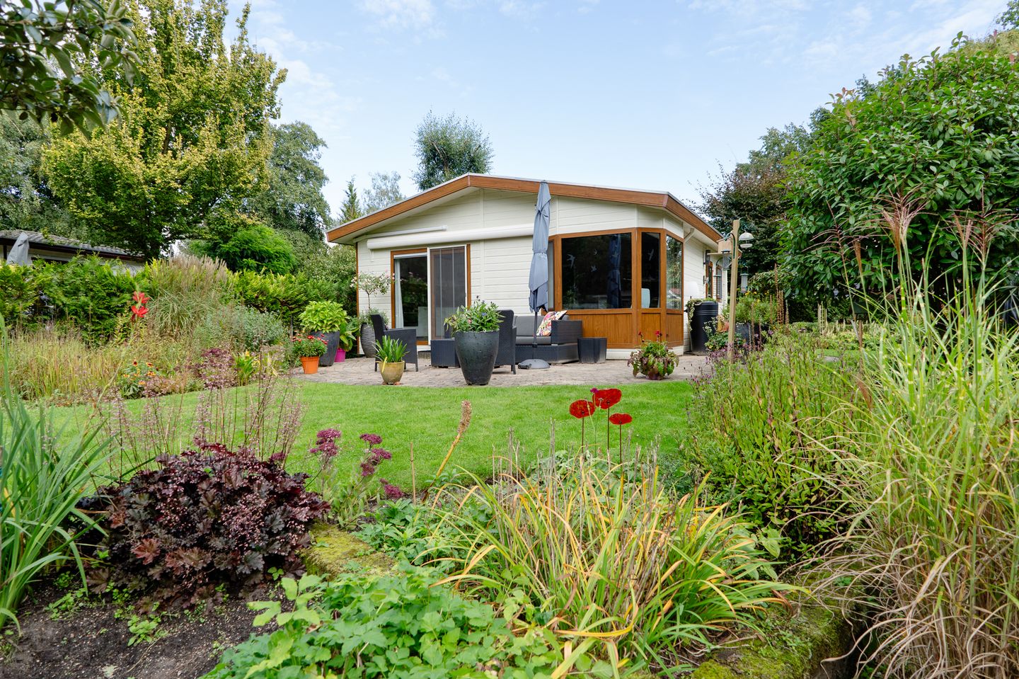 De tuin is gesitueerd aan de achterkant en zijkant van het chalet. Het betreft een prachtig ingerichte tuin met rijk bloeiende borders, een fris groen gazon en een meanderend paadje naar de berging. Een groene oase met een ruim terras die van de zijkant doorloopt naar de achterkant. De ligging aan de vijver zorgt voor een leuke doorkijk en een gevoel van vrijheid en ruimte. Door de ligging op het zuidwesten heb je ook voldoende zon.