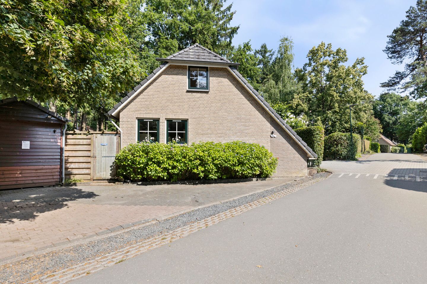 Je parkeert de auto eenvoudig voor de deur en betreedt de woning aan de zijkant, of via de praktische achterom. In de hal vind je het toilet, de badkamer met douchecabine en wastafelmeubel, en een ruime inpandige berging met wasmachineaansluiting: handig om spullen op te bergen of een was te draaien na een dag in het bos.