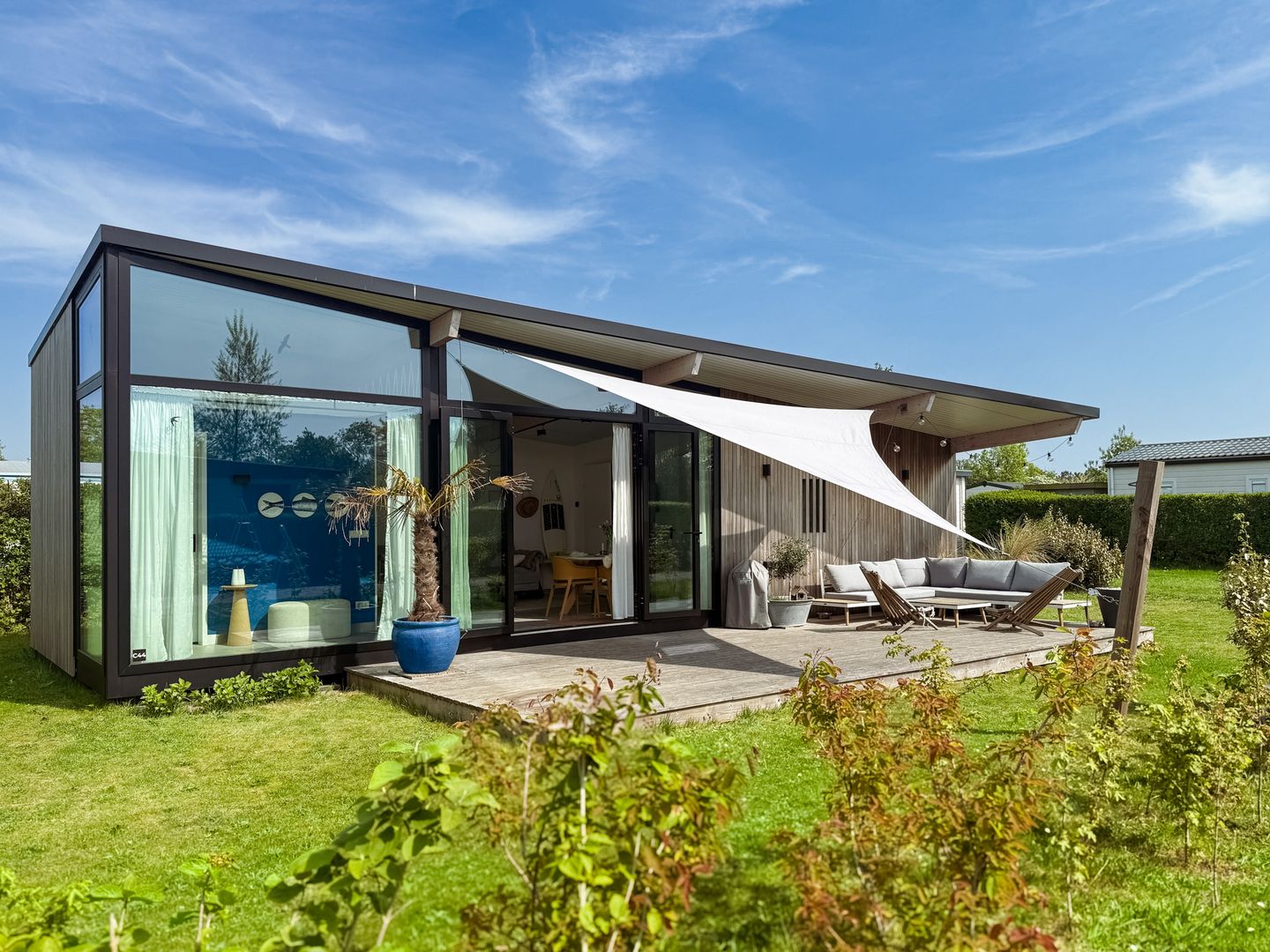 Deze moderne en duurzame cabin is gebouwd in de zomer van 2022 door de Nederlandse leverancier Lancet Living en nu te koop! Het stijlvolle design, de duurzame materialen (staal - hout - glas & beton) en de grote ramen bieden een unieke vakantie-ervaring in een prachtige omgeving slechts 800 meter van het strand! De speelse indeling, met een loft-achtige sfeer en een nokhoogte van 3,5 meter, versterkt het gevoel van ruimte, terwijl houten balken zorgen voor een natuurlijke en authentieke uitstraling.