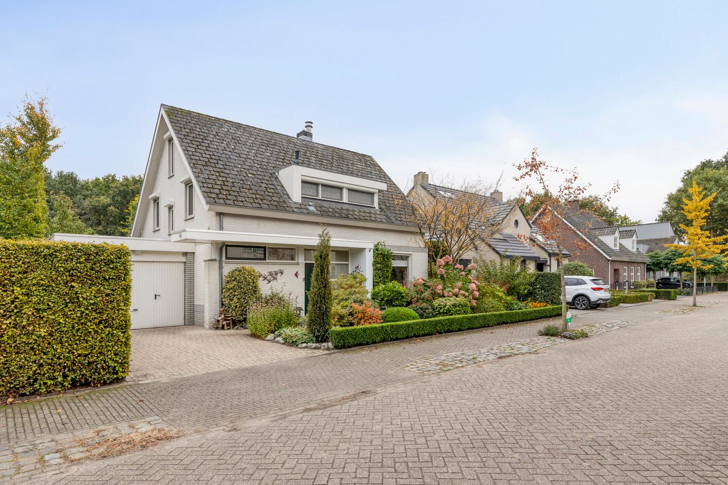 Keurig aangelegde voortuin met oprit.