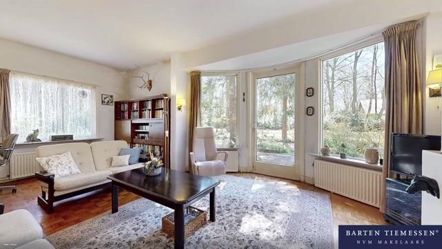 Aan de ene zijde van de woonkamer zorgen grote raampartijen voor een lichte, bijna serreachtige sfeer. Ze bieden niet alleen een fraai uitzicht op de omgeving, maar laten ook een overvloed aan daglicht binnen. De andere zijde is momenteel ingericht als zitkamer en beschikt over een erker met een deur naar buiten.