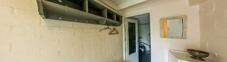 Durch die Eingangstür gelangen Sie in den Flur mit Zugang zum Wohnbereich und zum Badezimmer mit Dusche, Waschbecken und Toilette. Vom Flur aus erreichen Sie auch den Abstellraum im Haus.