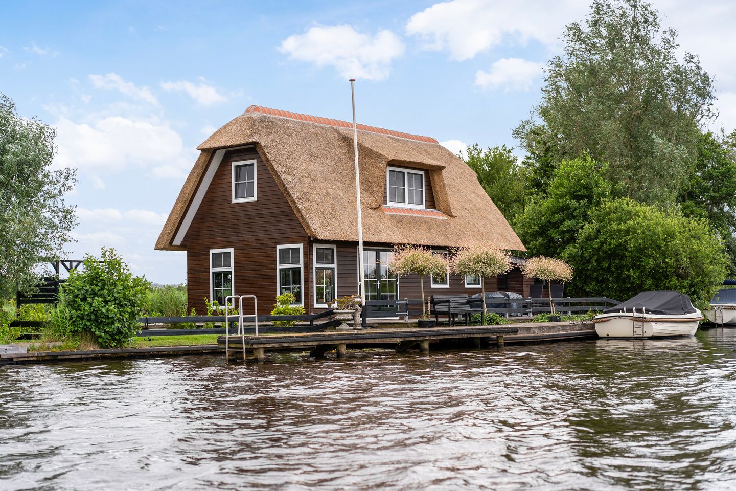 Rondom de woning ligt een royaal terras waar je op elk moment van de dag kunt kiezen tussen zon of schaduw, rust of reuring. De vlonders zijn recentelijk allemaal vernieuwd en sluiten prachtig aan op het omliggende landschap. Of je nu in de ochtendzon geniet van je eerste kop koffie, of ’s avonds dineert met uitzicht op het water, het leven is hier simpelweg goed. De eigen insteekhaven en de aanlegsteiger maken het eenvoudig om met sloep, zeilboot of sup het water op te gaan, en dat ongeacht de windrichting.