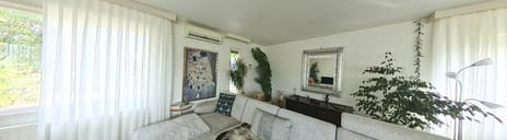 De lichte en comfortabele woonkamer is afgewerkt met een moderne laminaatvloer en voorzien van meerdere grote ramen, allemaal uitgerust met dauerluftung en horren. Ook het uitzetraam zorgt voor extra ventilatie en daglicht. Het plafond is voorzien van inbouwspots die zorgen voor een moderne uitstraling. De ruimte is uitgerust met een airconditioning die niet alleen koelt, maar ook kan verwarmen. Via de schuifpui, eveneens voorzien van een hor, bereikt u het aangrenzende terras. Hier geniet u van het buitenleven in alle rust en comfort, mede dankzij de elektrisch bedienbare zonluifel die beschutting biedt op zonnige dagen.