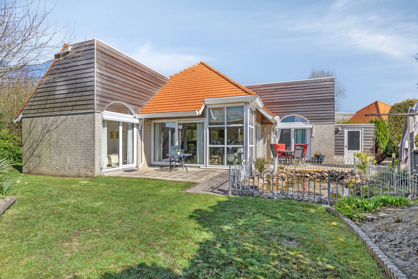 De tuin is heerlijk gelegen op de zon en omzoomd door aangelegde duintjes. Rust en privacy is hierdoor zeker gewaarborgd. En met het extra terras kunt u lang genieten van de (avond)zon met vrienden en/of familie.