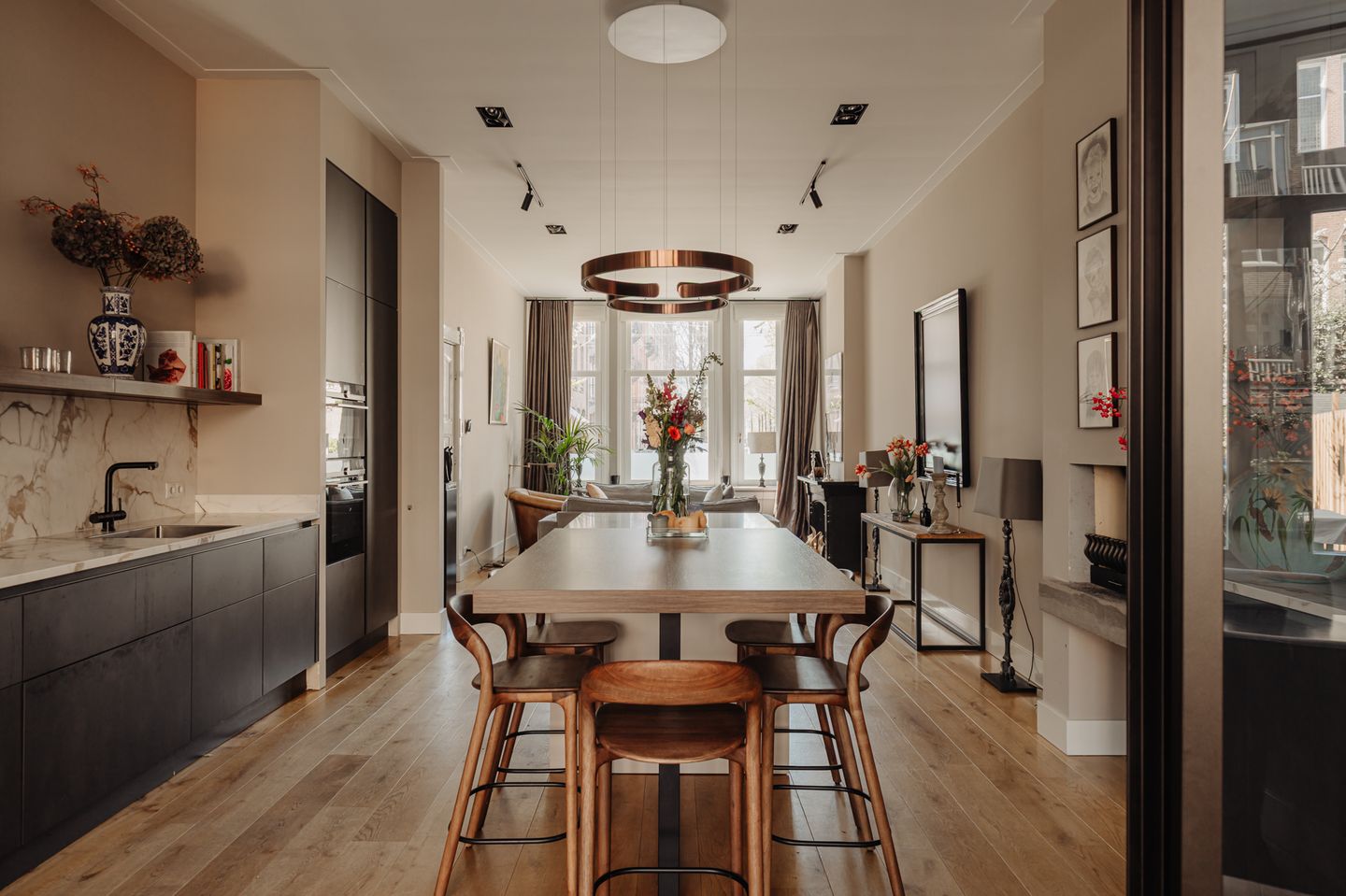 Upon entering, the high ceilings, space and light immediately appeal to the imagination. On this floor is the spacious living area with open kitchen, this tasteful space forms the heart of the house, where living and cooking come together. The open kitchen is equipped with integrated appliances and has a cozy seating area at the island. The living room at the front is bathed in daylight thanks to the large windows and offers a unique and unobstructed view of the Frans van Mierisstraat. The sight lines, the color palette and the natural materials provide a balanced living experience with attention to detail and harmony.