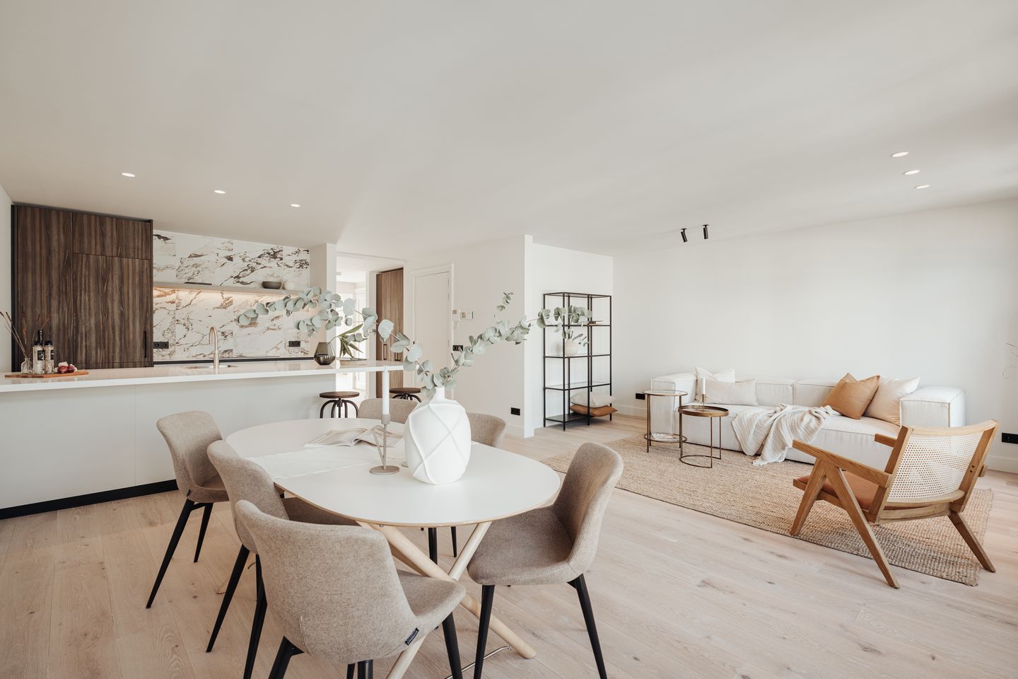 Upon entering via the staircase or elevator, the living room with a modern open kitchen at the front immediately captures the imagination. The custom-designed kitchen is equipped with built-in appliances, including an electric cooktop with an integrated downdraft ventilation system. At the rear, two bedrooms overlook the inner gardens, where the wide-opening exterior windows and door create a spacious and airy feel. Light materials and neutral colors have been used, giving the apartment an elegant and luxurious ambiance. The bathroom, featuring a double sink with storage space and a walk-in shower, is designed with a sleek and contemporary aesthetic.