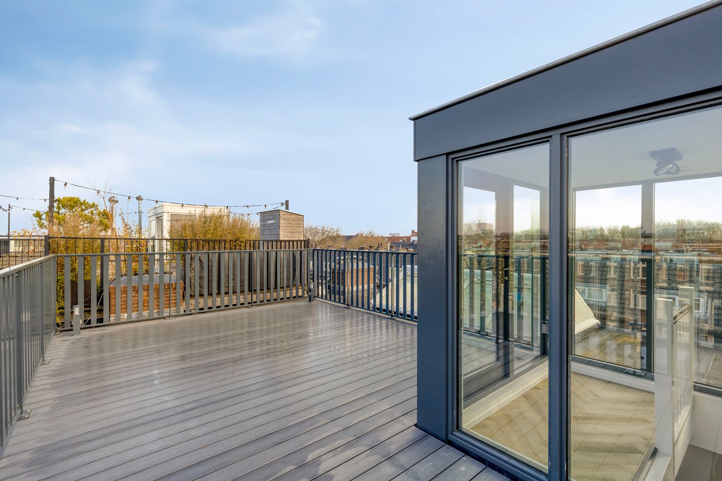 At the front of the apartment is the bright and inviting living room with a modern open kitchen. The kitchen is fully equipped with high-end appliances, including a fridge-freezer combination, wine climate cabinet, induction cooktop, combi oven, dishwasher, extractor hood, and a Quooker—making this space ideal for cooking enthusiasts. At the quiet rear side of the home are two spacious bedrooms of approximately 17 m² and 10 m². The contemporary bathroom features a rain shower and a double washbasin with vanity. In addition, the apartment includes a separate toilet and a practical laundry room with space for a washing machine and dryer. The absolute highlight of this home is the generous 32 m² rooftop terrace, where you can relax, dine in the evening sun, or enjoy long summer nights with views over the city.