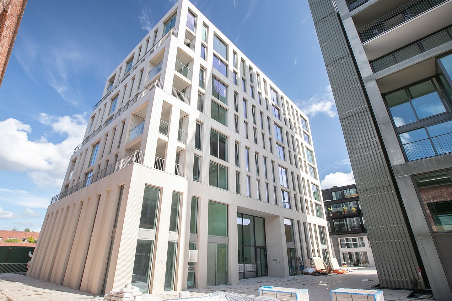 This apartment is part of a newly built complex with an industrial and luxurious appearance. The building features a distinctive stepped façade and a façade garden adjoining the living room. The property is accessed via a inner courtyard.