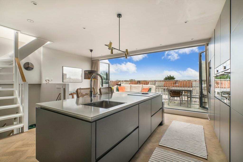 De loft-achtige woonkamer met prachtige lichtinval is voorzien van een geweldig terras van ca. 14m2! De harmonicapui van ca. 6 meter breed kan volledig worden opengeschoven. Op deze manier wordt het terras een verlengde van de woonkamer.
