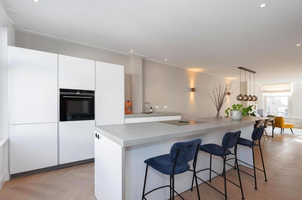You reach the private entrance on the second floor via the staircase. The hallway has a large tailor made built-in closet and a separate toilet. Through the glass doors you step into the spacious and bright living. The living room in the front is L-shaped, with a cosy fireplace. In the back, there is a brand new open-concept Bulthaup kitchen with handleless cabinets. All kitchen appliances are built-in, including the refrigerator, freezer, oven and microwave combination, dishwasher, and a Bora induction cooking plate including built-in aspiration technology.