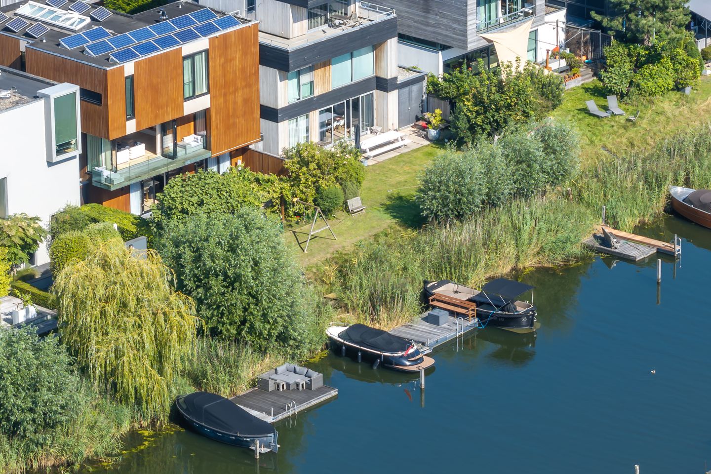 This exceptionally spacious and free-standing villa, finished to an impeccable standard and located directly on the water, offers approx. 277 m² of living space. Featuring a generous south-facing garden, five bedrooms, a study, a guest room, three bathrooms, and four toilets. Constructed under high-quality architectural design, the home provides parking for up to four cars as well as a deep, sunny backyard with private jetty and mooring.