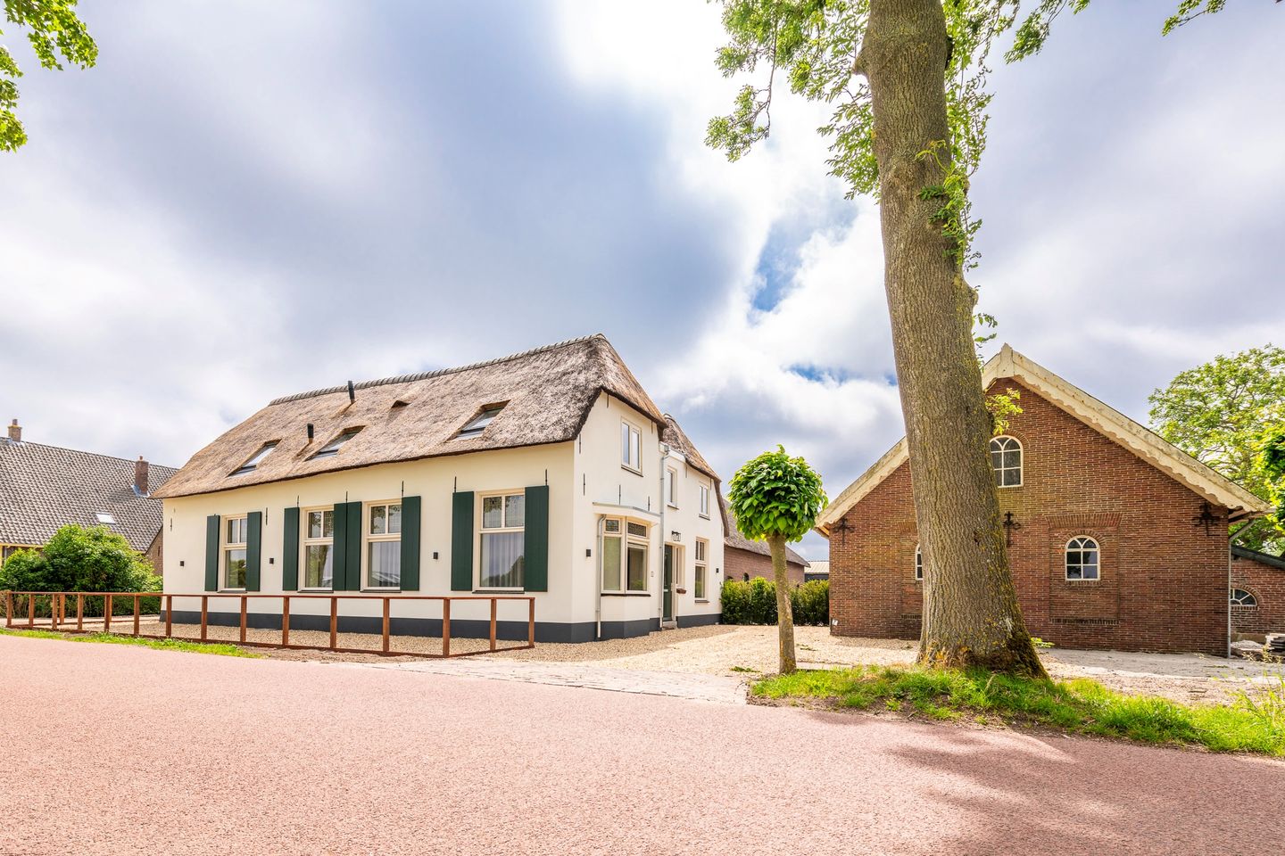 The open-plan kitchen is a true showpiece. It features an induction cooktop with built-in extraction, a Quooker for instant boiling water, a wine fridge, a large refrigerator and freezer, and plenty of storage space. The kitchen flows seamlessly into the warm and inviting living room. Here, the exposed wooden beams, natural color palette, linen curtains, and views over the greenery create a peaceful, homely atmosphere. Large windows in every room provide plenty of natural light and enhance the spacious feel of the home.