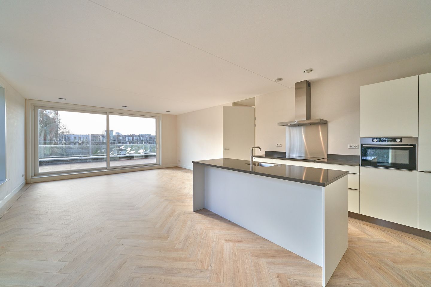 Every room in this penthouse is finished with high-quality materials, including a beautiful PVC floor, white-painted baseboards, and ready-to-paint walls. The open kitchen is equipped with modern ATAG appliances, such as an induction cooktop with a stylish stainless steel backsplash, a refrigerator-freezer combination, an extractor hood, a dishwasher, a Quooker, and a combination microwave. The bathroom is a luxurious oasis, fully tiled with white wall tiles and dark floor tiles, and featuring top-quality sanitary fixtures.