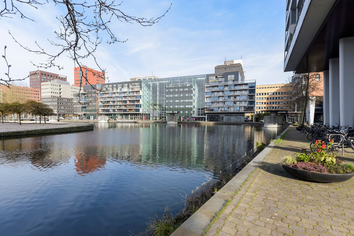 Centrally in a beautiful apartment complex located, high-quality finished, luxurious, trendy and spacious 3-room corner apartment (no upstairs neighbours) with beautiful parquet floors and a spacious 24m² sun terrace (Southeast) with a spectacular view over water and the surrounding area, which provides various nice catering establishments. the house has two spacious bedrooms, a luxurious bathroom, a modern open kitchen and a Q-park parking space.