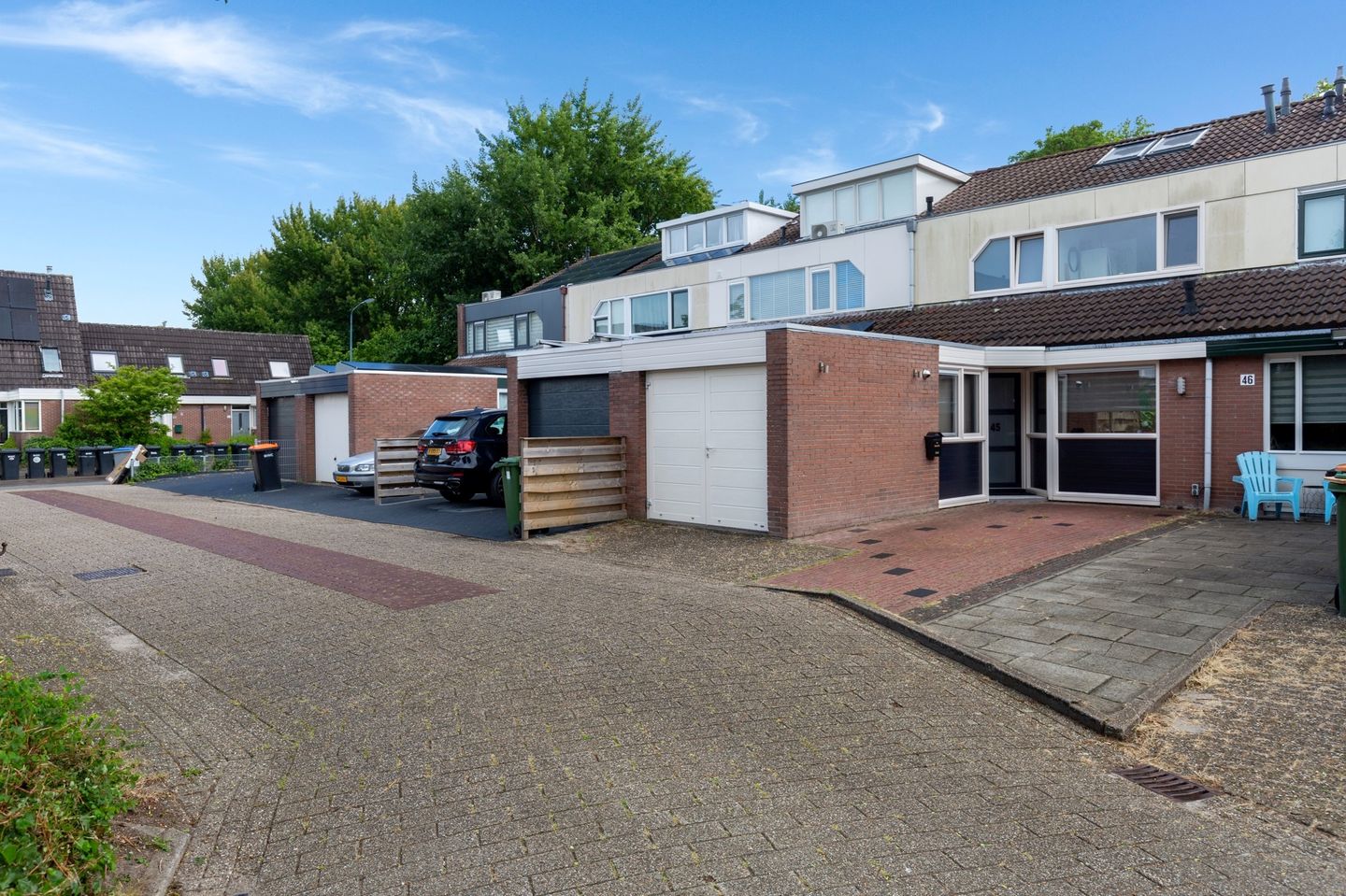 De diepe achtertuin ligt op het noordoosten (ochtendzon), maar dankzij de diepte is er de hele dag zon. De tuin is voorzien van een berging, afdak en achterom. Aan de voorzijde is een extra berging gerealiseerd doordat de voormalige garage is omgebouwd, met behoud van een praktische bijkeuken.