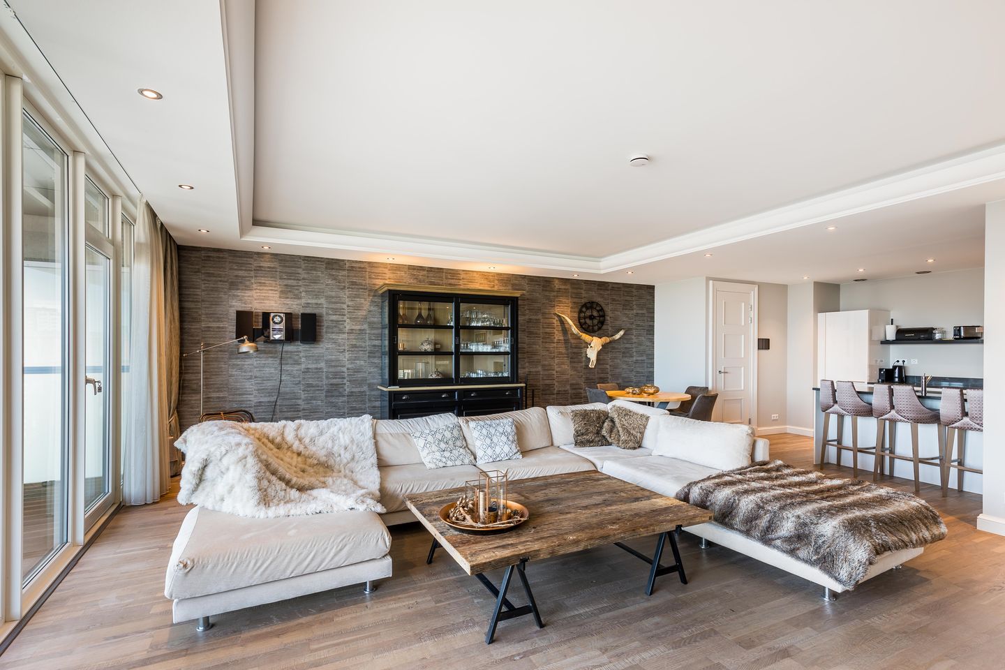 Through the hallway, you immediately walk into the big living space. The living room boasts a spacious corner sofa with stylish details. Behind the large sofa you’ll find the cozy dining space with a round wooden table that seats four. From the comfortable living room, you have a magnificent view over all of Rotterdam. Behind the living room is the open kitchen, fully equipped with all necessary appliances.