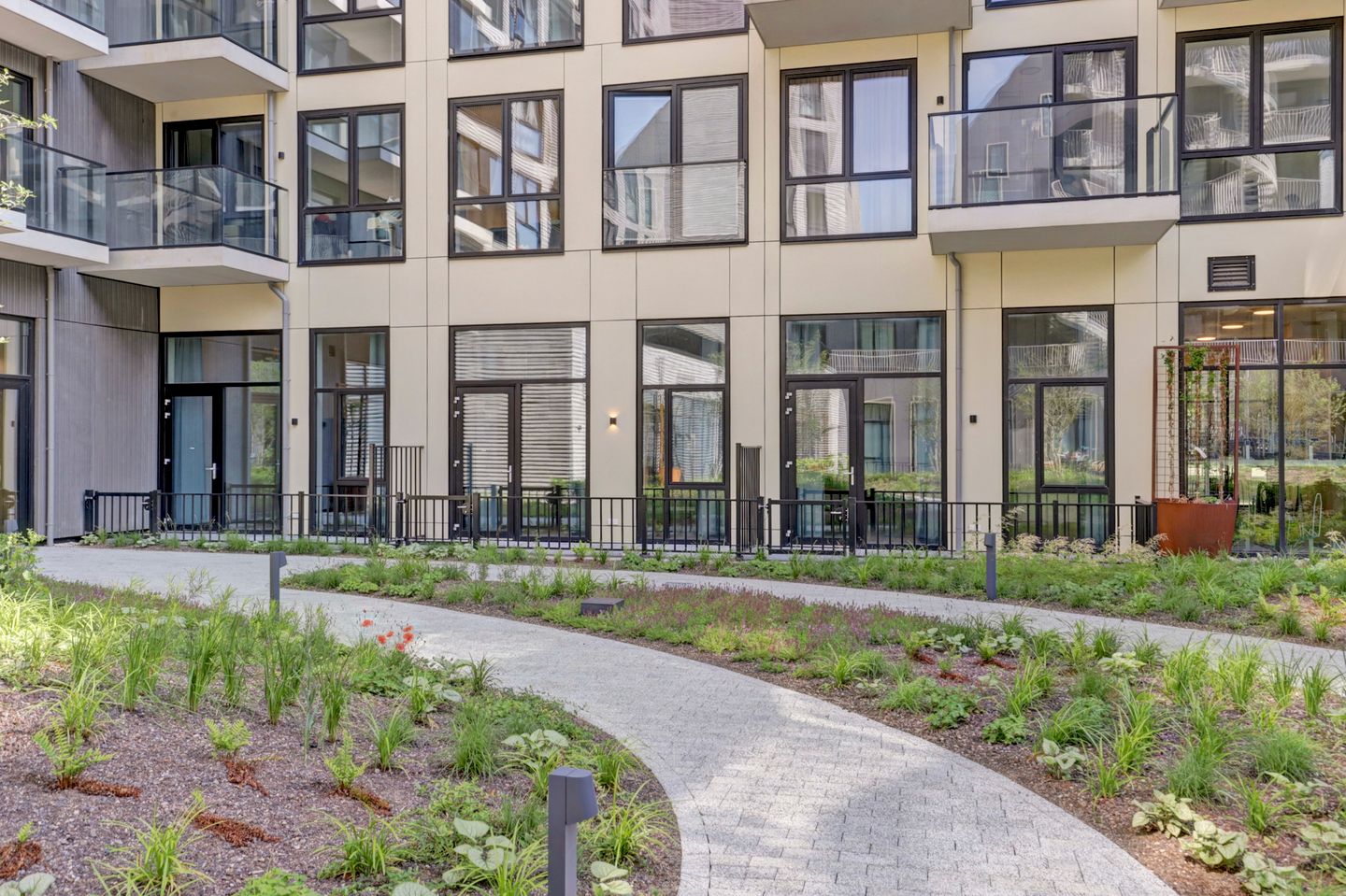 De woonkamer beschikt over een moderne leefkeuken met diverse inbouwapparatuur, waaronder een inductiekookplaat, recirculatie-afzuigkap, koelkast, separate vriezer en combimagnetron. Vanuit de woonkamer heeft u directe toegang tot uw eigen buitenruimte. Deze privé buitenruimte grenst aan de gemeenschappelijke binnentuin, waardoor u het gemak hebt van een gedeelde groene ruimte, direct bereikbaar vanuit uw eigen tuin.