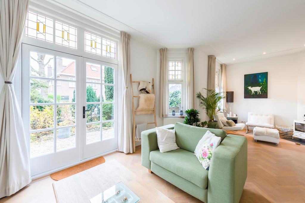 Entrance with cloakroom and wooden bench, original spacious hall, toilet with hand basin. Bright living room with French doors to the front garden. Stained glass windows around. Attractive wood stove. Nice living kitchen at the back of the house consisting of spacious dining room with all around original stained glass windows and lead doors to the backyard, and spacious luxury kitchen with fridge, freezer, dishwasher, oven, microwave, induction hob, extractor and large worktop . Also from the kitchen access to the garden. Sunny back garden of approximately 55 m2 located on the east and with lots of privacy, where you can enjoy the morning and afternoon sun. At the front is a spacious front garden of 70 m2 located on the west with cozy sitting area where you can enjoy the afternoon and evening sun!